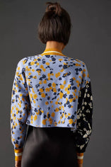 Discover our Multitone Floral Cardigan. This short sweater features a striking contrast of dark and pastel floral blocks, accented by bright striped orange cuff sleeves and an open front. Perfect for layering over dresses, jeans, or work attire, it adds a touch of festive flair to any outfit.