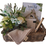 A beautiful basket of curated gifts to welcome a new baby. The basket includes a small flower arrangement with pops of seasonal blue flowers, Organic cotton lovey with a pacifier attachment, bath soak tube for the new mama, and a beautifully illustrated book by Emily Lex.