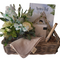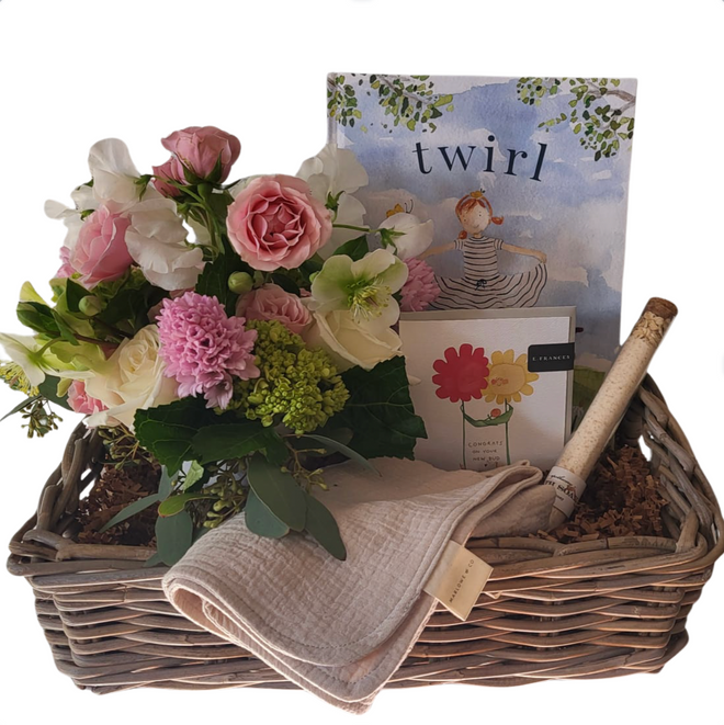 A beautiful basket of curated gifts to welcome a new baby. The basket includes a small flower arrangement with pops of seasonal Pink flowers, Marlow & Co. organic cotton lovey with a pacifier attachment, bath soak tube for the new mama, and a beautifully illustrated book by Emily Lex.