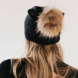 The softest beanie you can find. This gorgeous hat will carry you through the colder months in style. Fur pom is removable. Slouchy fit.