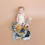 A whimsical baby blanket, adorned with juicy blueberries, busy bees, and Harper Bear. Crafted with utmost care, this blanket is made from 100% GOTS certified organic cotton, ensuring the softest and safest embrace for your baby's delicate skin. Wrap your precious bundle in comfort and style with this eco-friendly, irresistibly cute baby blanket that promises both warmth and peace of mind. Match with a bear or classic hat, cardigan, teether or lovey.