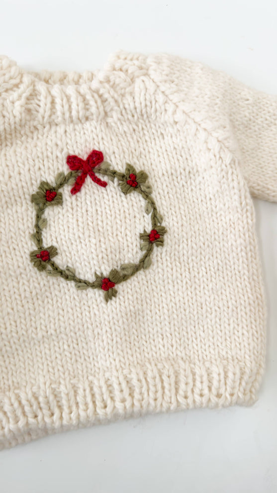Deck the halls with our festive Wreath Sweater. This Cream sweater features a hand-embroidered Moss wreath with Red berries and a simple bow. Pair with our Present Hat or Classic Pom Hats.