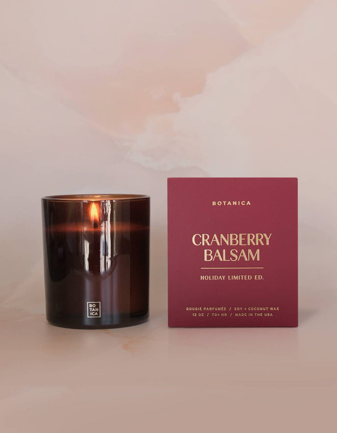 New for 2025, our Holiday Collection includes six favorite fragrances that celebrate the best of the season. Cranberry Balsam is a classic mix of fresh holiday greens & bright cranberry notes. A delicious fragrance that works in any room of your home; from kitchen, to bath, to living space– this candle sets a festive tone throughout the whole holiday season. Fragrance Notes: Balsam + Fir, Cranberry, Red Currant • 12 oz. Soy & Coconut Wax Blend • 75+ Hour Burn Time • Weighted Amber Glass