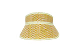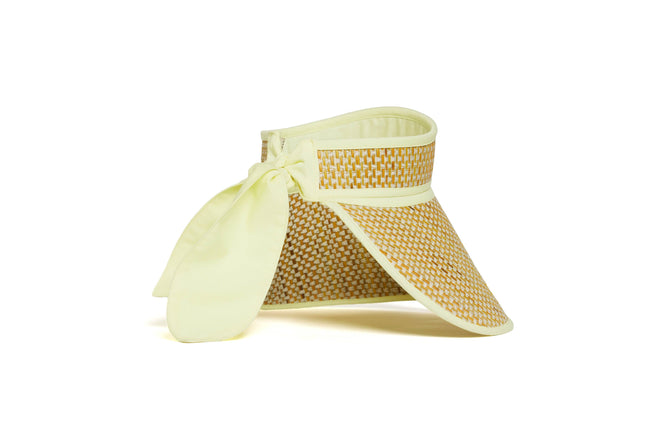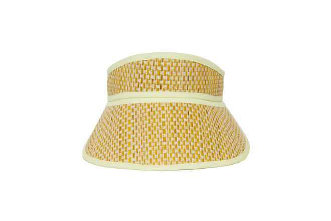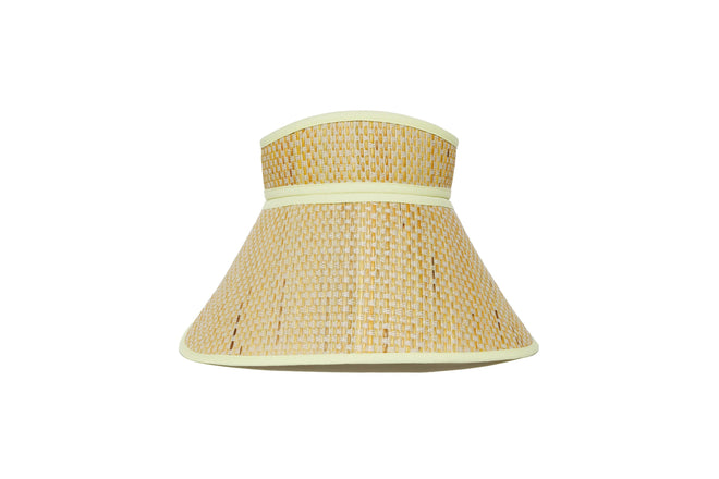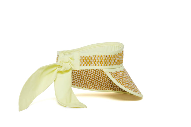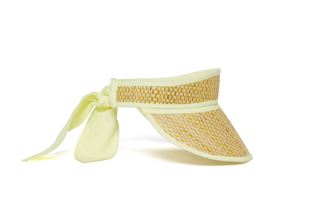 Byron features white-coloured thread in a basket weave, woven through its natural grass fibre base, which has been lightly hand-dyed to create a sunny yellow base, with pastel yellow fabric trimming.