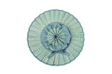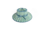 Kauai features thick milk-white thread woven in a vertical diamond weave, through its bright sea-foam-green hand-dyed fibre base, with teal-coloured fabric trimming.