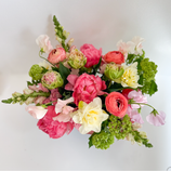 Celebrate Mom with this exquisite vase arrangement, a symphony of soft pinks, creams, and lush greens. Delicate peonies, roses, and other springtime blooms mingle in a gentle embrace, accented by a touch of vibrant coral or peachy-pink.