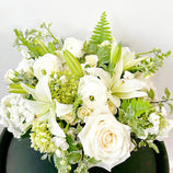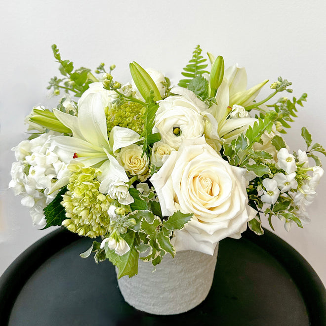 Details: Designed with white playa blanca roses, dutch mini green hydrangea, white ranunculus accented with white stock and phlox. As we near spring the arrangements will be accented with spring blooms such as white tulips, hyacinths and daffodils.