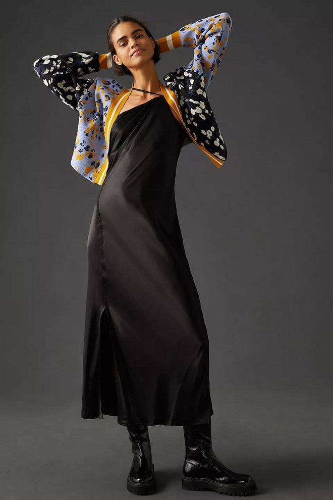 Discover our Multitone Floral Cardigan. This short sweater features a striking contrast of dark and pastel floral blocks, accented by bright striped orange cuff sleeves and an open front. Perfect for layering over dresses, jeans, or work attire, it adds a touch of festive flair to any outfit.