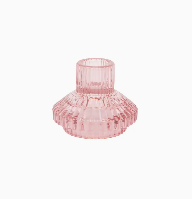 A stunning table decorations, home décor or gift, this pink glass candle holder has a geometric, ribbed design to add texture and height to any room. With its subtle color and elegant silhouette, this candle holder will elevate a table setting, mantel or windowsill when paired with a spiral or straight dinner candle.