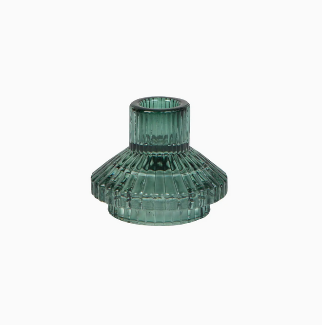 A stunning table decorations, home décor or gift, this green glass candle holder has a geometric, ribbed design to add texture and height to any room. Perfect as holiday home décor for Christmas or Thanksgiving, but equally as stunning all year round on a dining table, coffee table or mantel when paired with spiral or straight dinner candles.