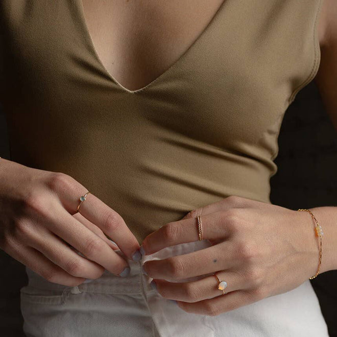 One of our favorite stacking rings with a literal twist! Pairing this with our Hammered Stacking Ring and our Midi Spiral Ring is our favorite way to get creative with ring stacks.