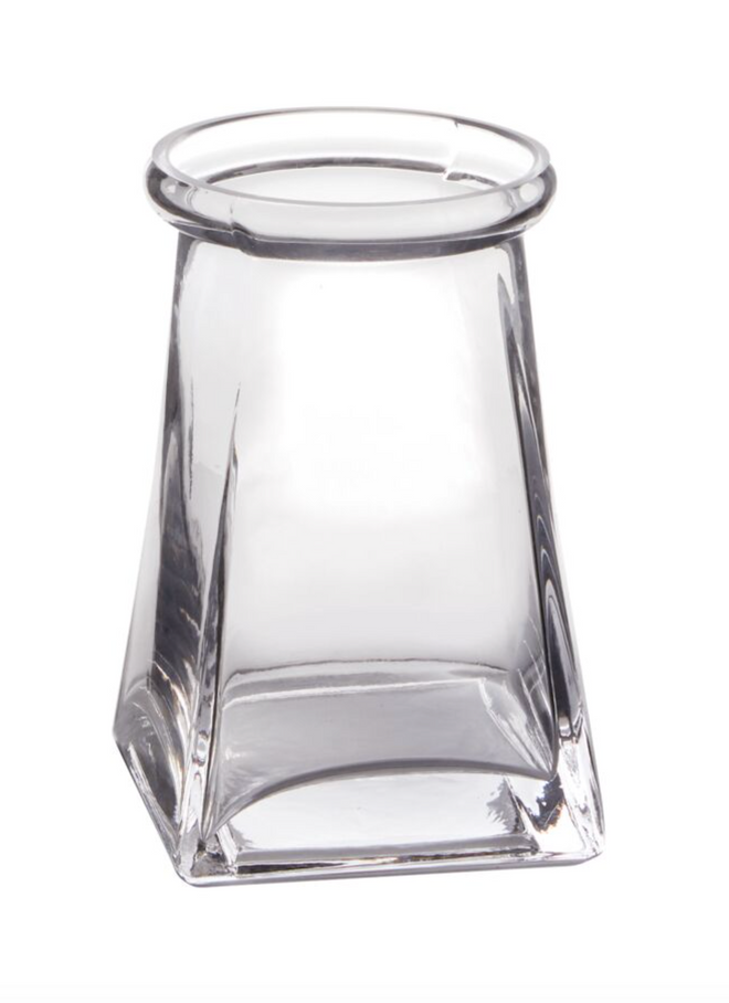 The Oslo Vase has a squared pyramid shaped base that tapers up to a wide circular lip. This simple and elegant vase will fit in at any event or special occasion.