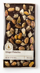 Straight up sweet and spicy perfection. Crunchy roasted pistachio and spicy candied ginger adorn rich 70% dark chocolate creating a robust swirl of flavors on your palate.