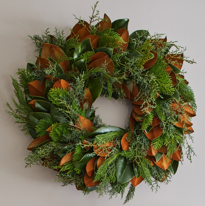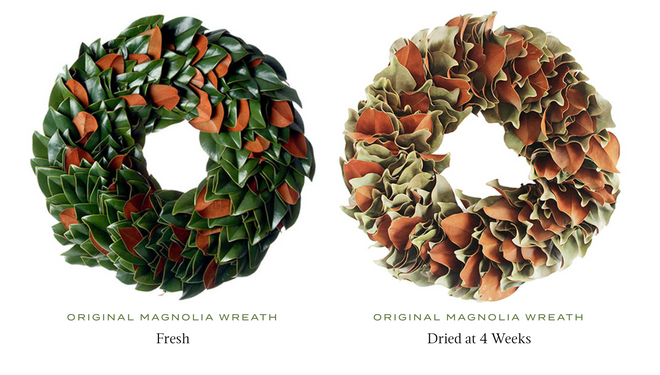 Fresh Magnolia Designs are hand-made leaf by leaf from a family farm in Florida. The fresh wreaths, swags, mantelpieces and garlands begin their aging process once shipped. All products dry naturally once hung or displayed. Once dry, you may choose to store in the sturdy box provided for future use, but be sure to discard any fresh greenery.